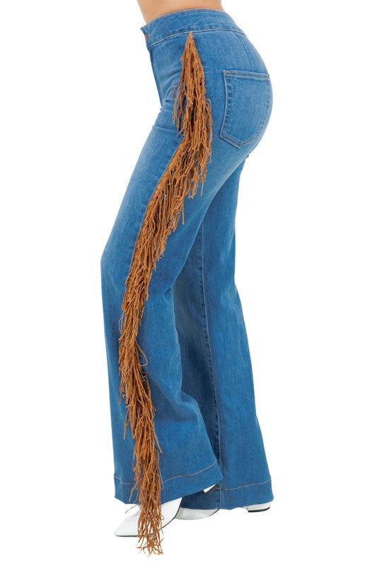 The Harley Wide Leg Fringe Jean is crafted in the USA! These bottoms boast a wide leg silhouette and a 2 inch inseam, complete with a front button and zipper closure, striking back pocket details, side tassel fringe detail, a 12 Inch High Rise , Medium Blue Wash Denim, 11 oz Heavy stretch premium Denim, delivers a comfortable stretch. #MadeinUSA